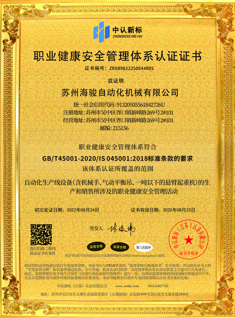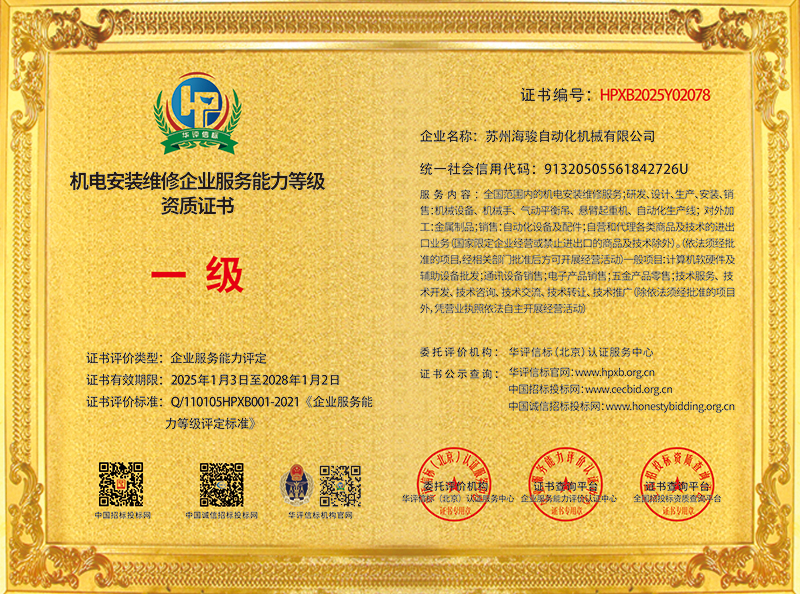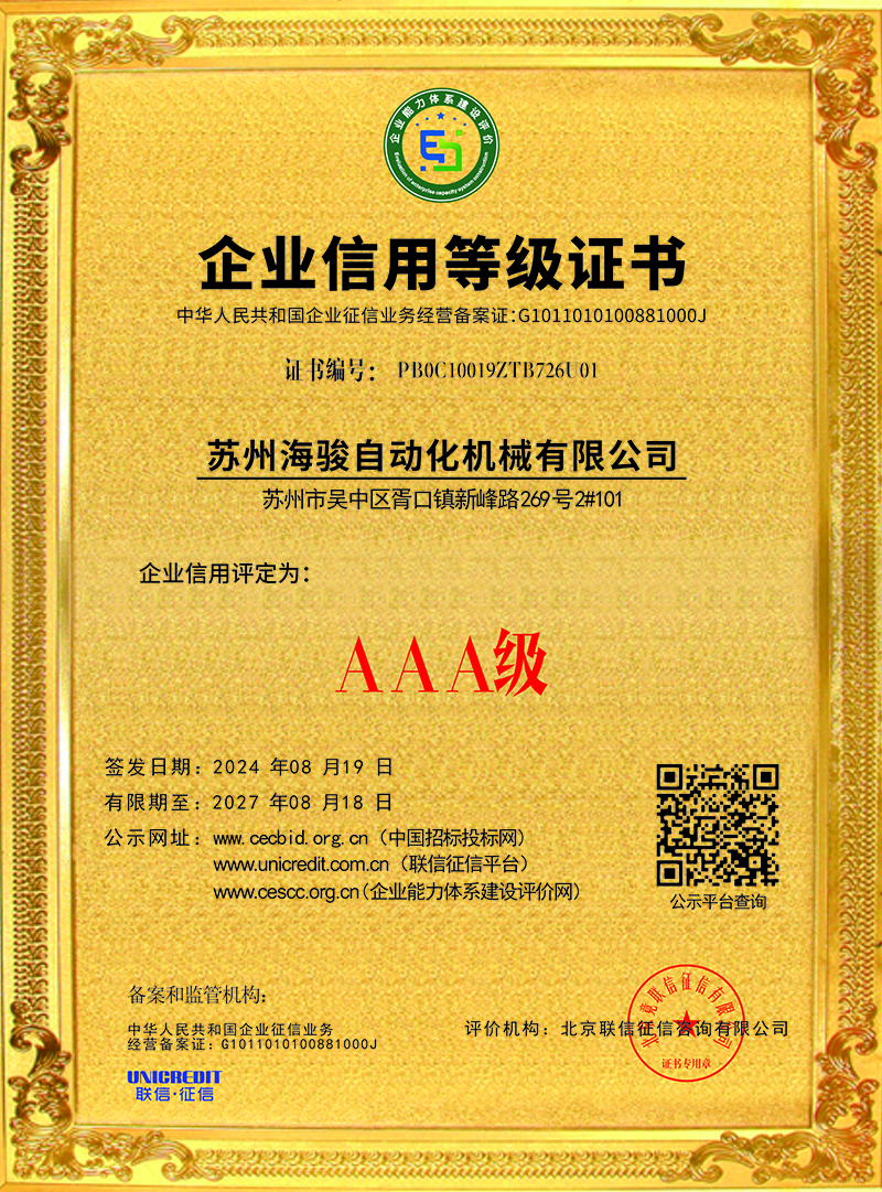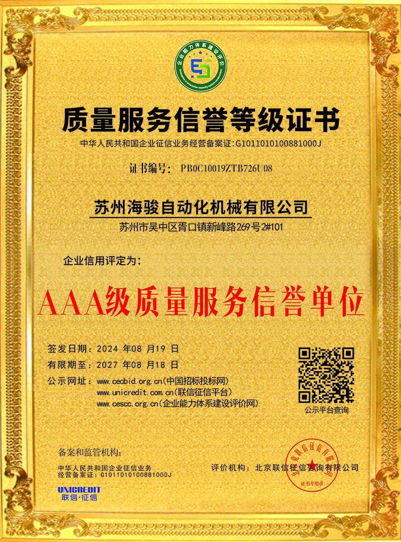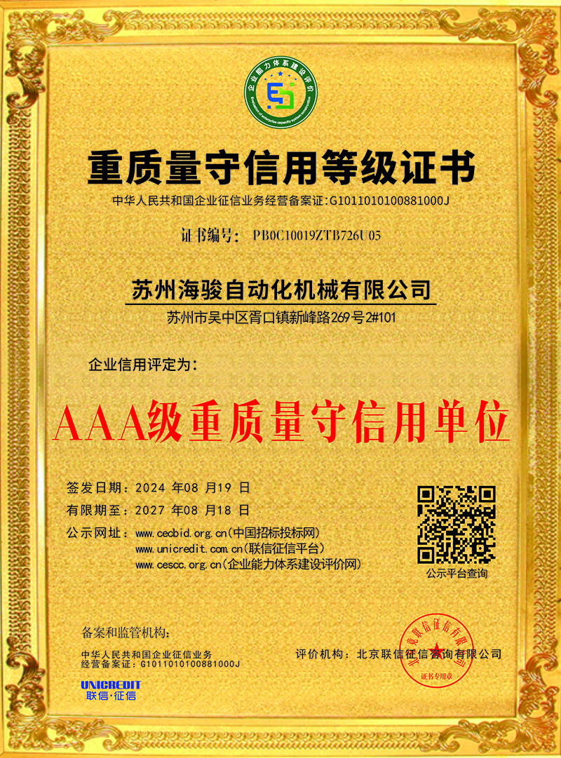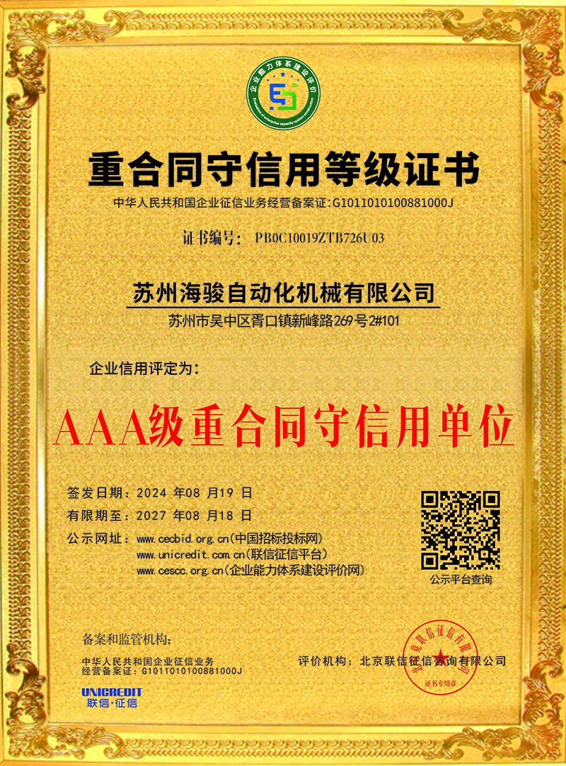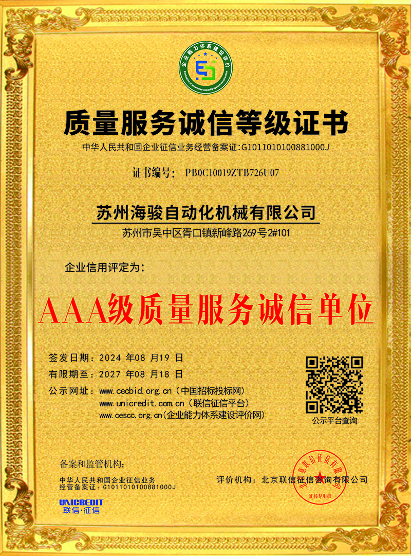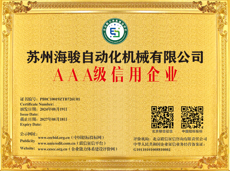 蘇州海駿自動化機械有限公司的誠信、實力和產(chǎn)品品質(zhì)質(zhì)量獲得了業(yè)界的認可!同時也被工商部門評為 “重合同、守信用”單位,歡迎各界朋友蒞臨蘇州海駿自動化機械有限公司參觀指導(dǎo)和業(yè)務(wù)洽談。